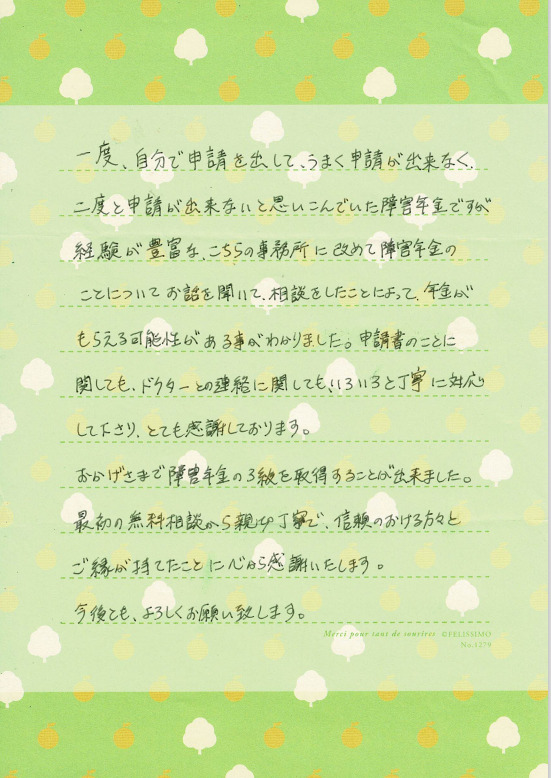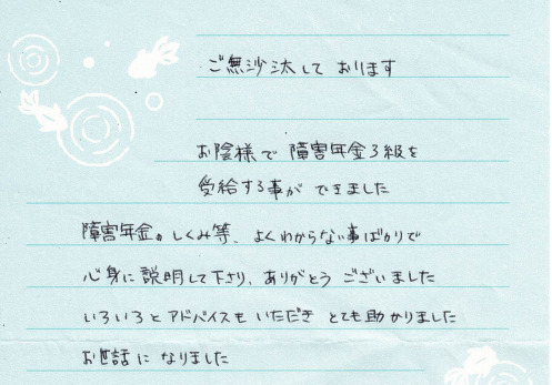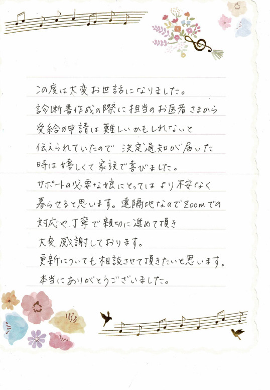 (スタッフより)                                                                             この度はお手紙をいただきありがとうございました。受給が決まり私共も大変うれしく思っております。今後もわかりやすい説明を心掛け、安心してご依頼していただけるようサポートをしていきたいと思います。