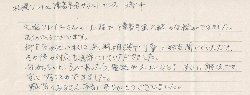 札幌ソレイユさんのお陰で、障害年金2級の受給ができました。ありがとうございます。