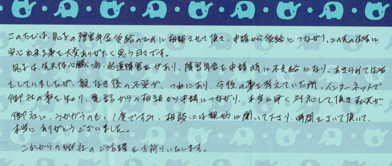 (スタッフより)                                                              この度はお手紙をいただきありがとうございました。受給が決まり私共も大変うれしく思っております。今後もわかりやすい説明と、丁寧な対応を心掛けていきたいと思います。