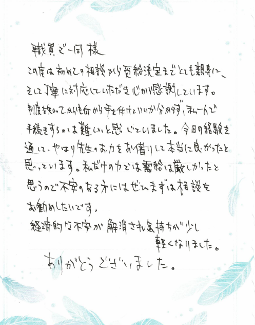 (スタッフより)                                                                             この度はお手紙をいただきありがとうございました。受給が決まり私共も大変うれしく思っております。今後も丁寧な対応を心掛け、少しでも不安が解消していただけるようサポートをしていきたいと思います。