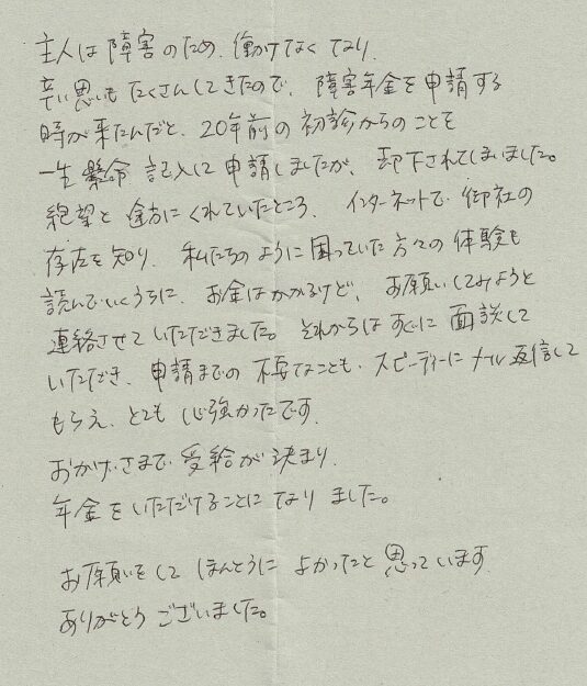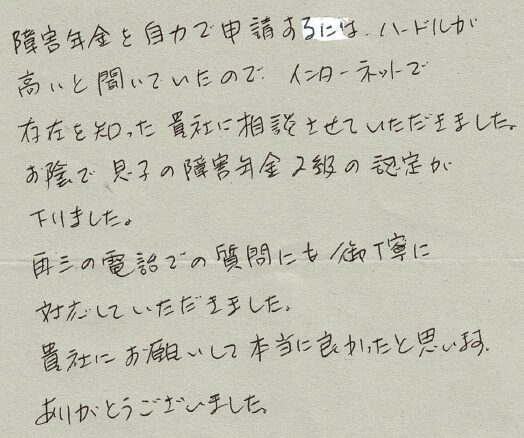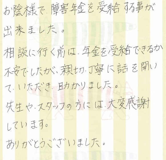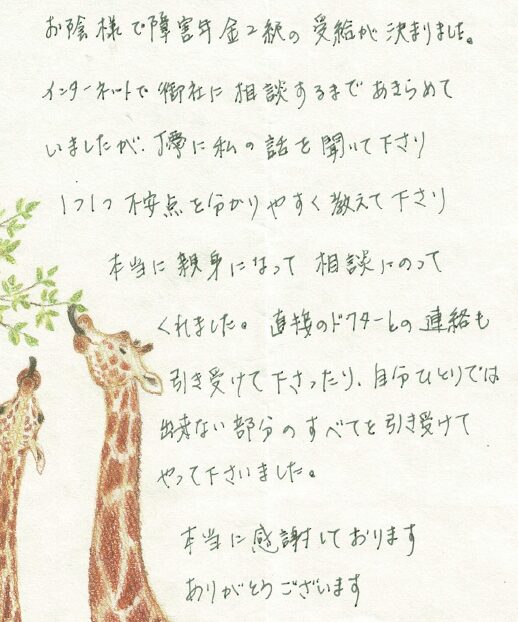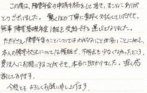 (スタッフより) この度はお手紙をいただきありがとうございました。受給が決まり私共も大変うれしく思っております。今後もご依頼者様に寄り添い、親切で丁寧な対応を心掛けてまいります。