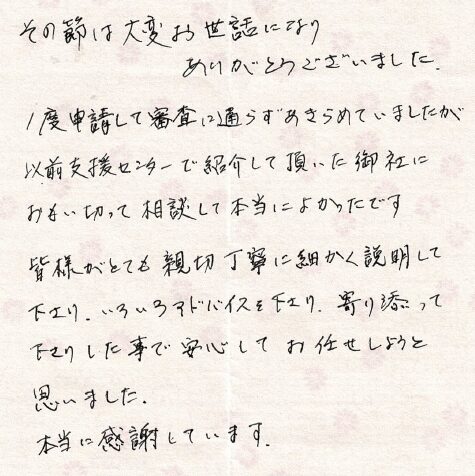 (スタッフより) この度はお手紙をいただきありがとうございました。受給が決まり私共も大変うれしく思っております。今後も親切で丁寧な対応を心掛け、安心してご依頼して頂けるよう努力してまいります。