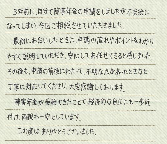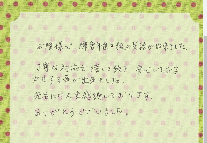 (スタッフより) この度はお手紙をいただきありがとうございました。受給が決まり私共も大変うれしく思っております。今後も丁寧なサポートを心がけて行きたいと思います。