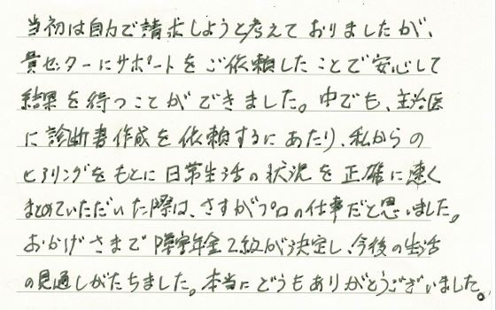当初は自力で請求しようと考えておりましたが、貴センターにサポートをご依頼したことで安心して結果を待つことができました。中でも主治医に診断書作成を依頼するにあたり、私からのヒヤリングをもとに日常生活の状況を正確に速くまとめていただいた際は、さすがプロの仕事だと思いました。おかげさまで障害年金2級が決定し、今後の生活の見通しがたちました。本当にどうもありがとうございました。