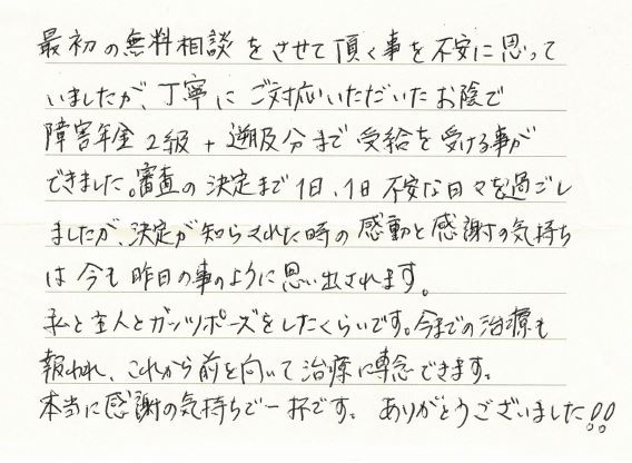 (スタッフより) この度はお手紙をいただきありがとうございました。受給が決まり私共も大変うれしく思っております。今後は安心して療養して頂きたいと思います。
