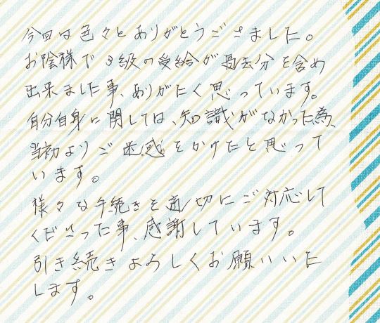 (スタッフより) この度はお手紙をいただきありがとうございました。受給が決まり私共も大変うれしく思っております。今後も丁寧な対応を心がけて行きたいと思います。