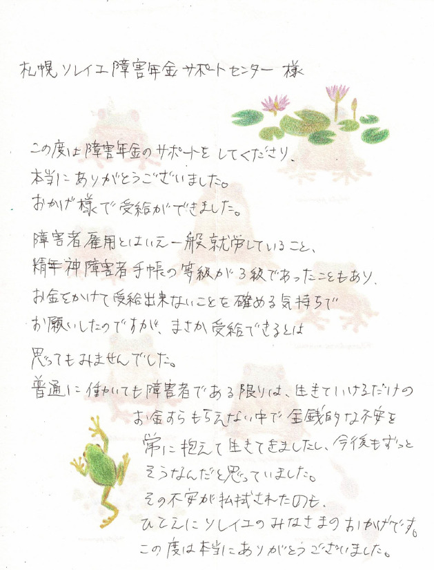 (スタッフより) この度はお手紙をいただきありがとうございました。受給が決まり私共も大変うれしく思っております。今後も丁寧でわかりやすい説明を心掛け、安心してお任せしていただけるようサポートしていきたいと思います。