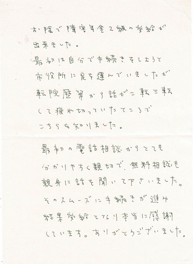 (スタッフより) この度はお手紙をいただきありがとうございました。受給が決まり私共も大変うれしく思っております。今後もわかりやすい説明を心掛け、安心してご依頼していただけるようサポートしていきたいと思います。