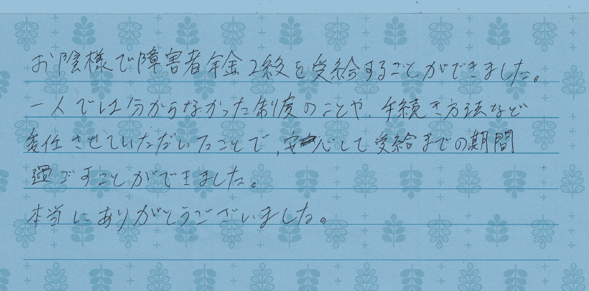 この度は障害年金のサポートをしてくださり、本当にありがとうございました。
