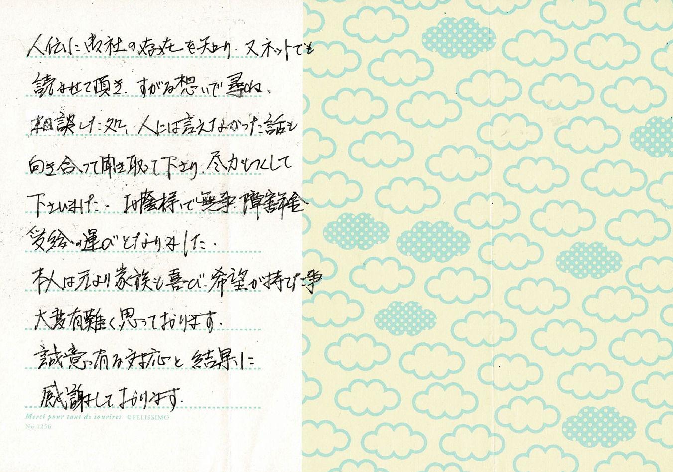 (スタッフより) この度はお手紙をいただきありがとうございました。受給が決まり私共も大変うれしく思っております。今後もご依頼者様の気持ちを第一に考えながらサポートをしていきたいと思っております。