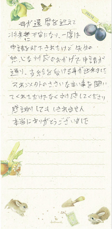 (スタッフより) この度はお手紙をいただきありがとうございました。受給が決まり私共も大変うれしく思っております。今後もご依頼者様が安心して任せていただけるよう、親身な対応を心掛けて行きたいと思います。