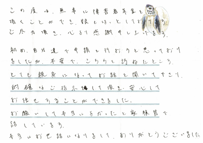 この度は、無事に障害者年金を頂くことができ、娘もほっとしております。ご尽力頂き、心より感謝申し上げます。