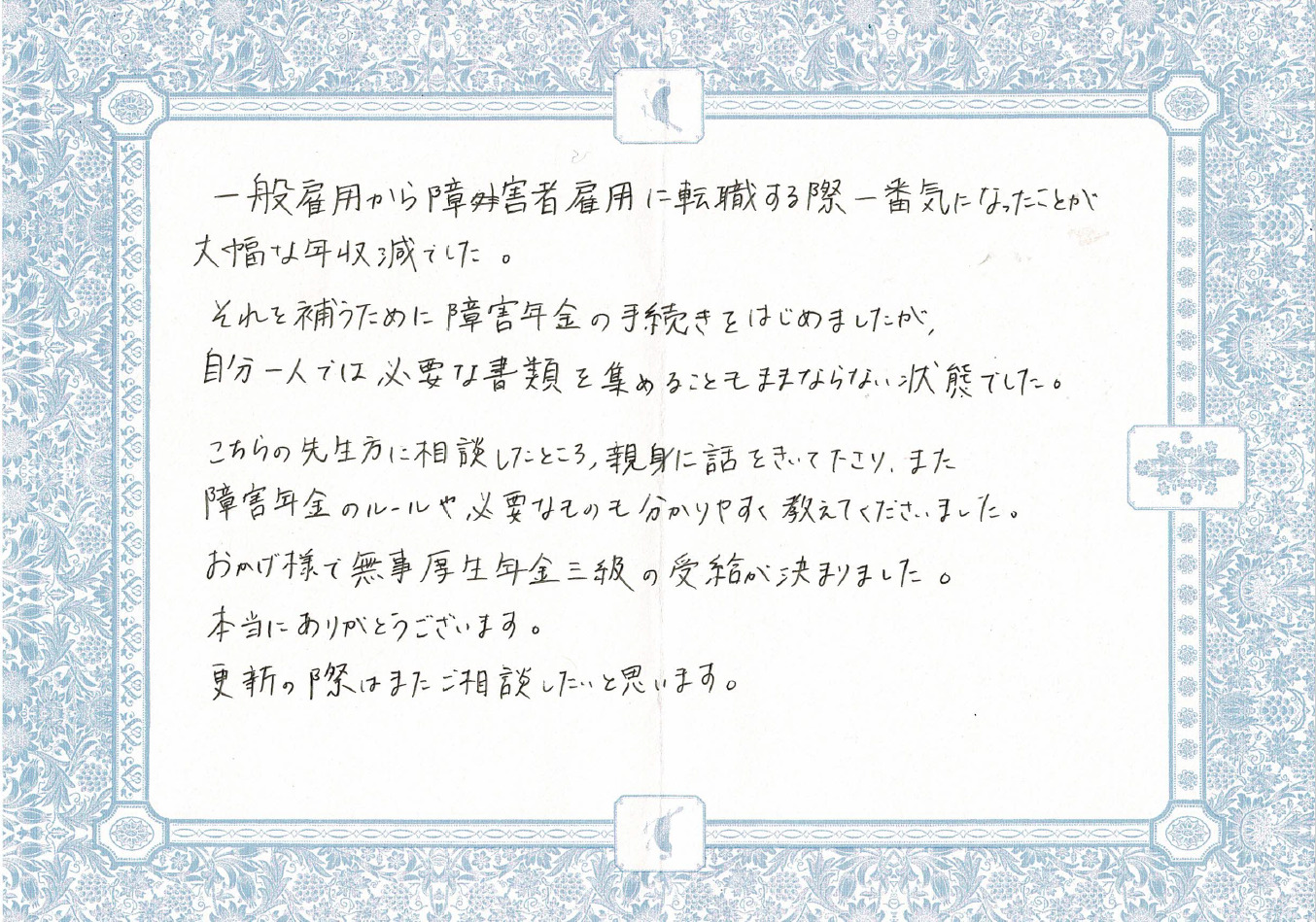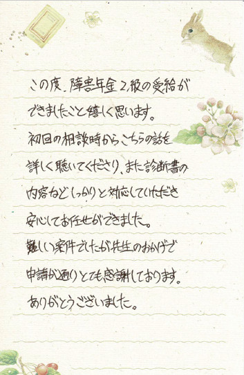 (スタッフより)                                                                             この度はお手紙をいただきありがとうございました。受給が決まり私共も大変うれしく思っております。今後も丁寧な聞き取りを心掛け、受給につながるよう精一杯サポートさせていただきたいと思います。