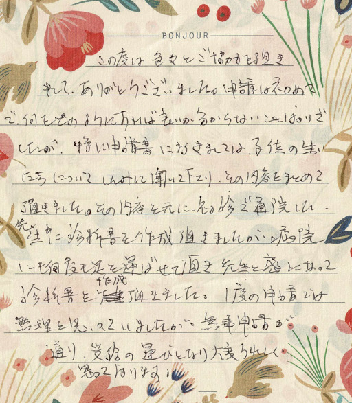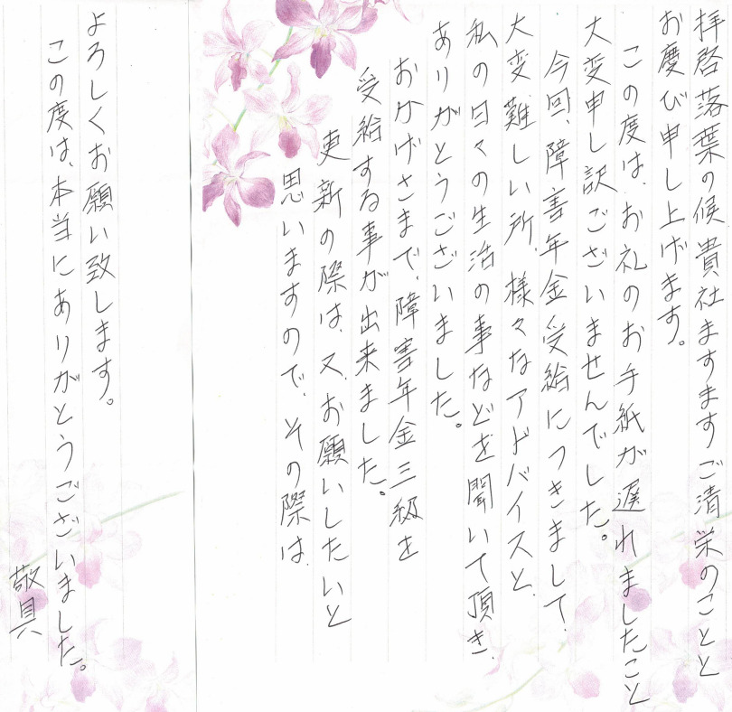 (スタッフより)                                                                             この度はお手紙をいただきありがとうございました。受給が決まり私共も大変うれしく思っております。今後もご依頼者様が安心して依頼していただけるよう、精一杯サポートさせていただきたいと思います。