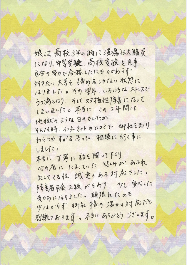 今回障害年金受給につきまして、大変難しい所、様々なアドバイスと、私の日々の生活の事などを聞いて頂き、ありがとうございました。