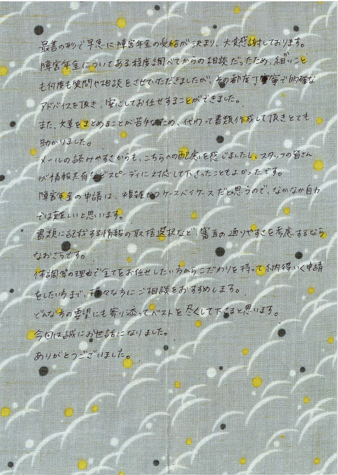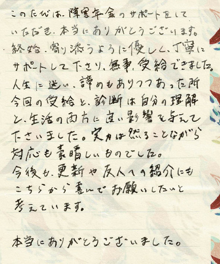 (スタッフより)                                                                             この度はお手紙をいただきありがとうございました。受給が決まり私共も大変うれしく思っております。今後もお客様に寄り添ったサポートを心掛けてまいりたいと思います。