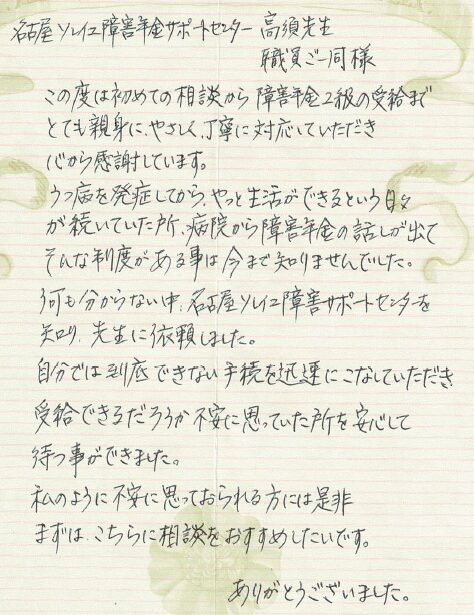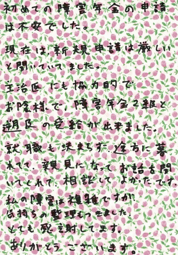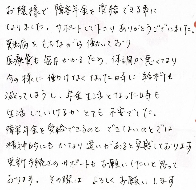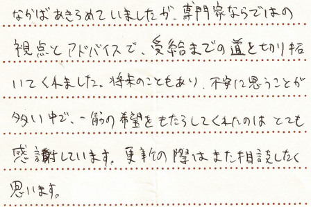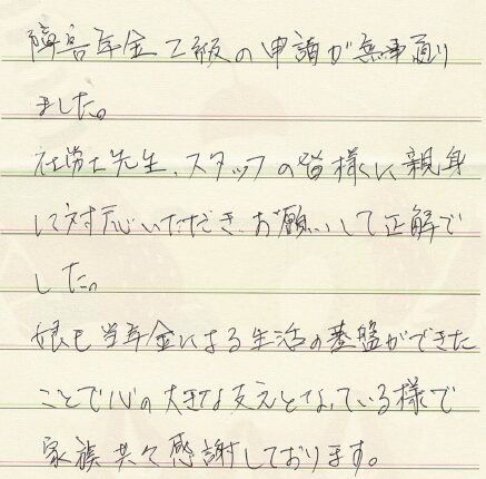 (スタッフより) この度はお手紙をいただきありがとうございました。受給が決まり私共も大変うれしく思っております。今後も安心してご依頼していただけるよう、精一杯サポートさせていただきたいと思います。