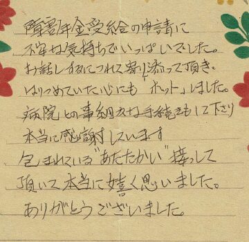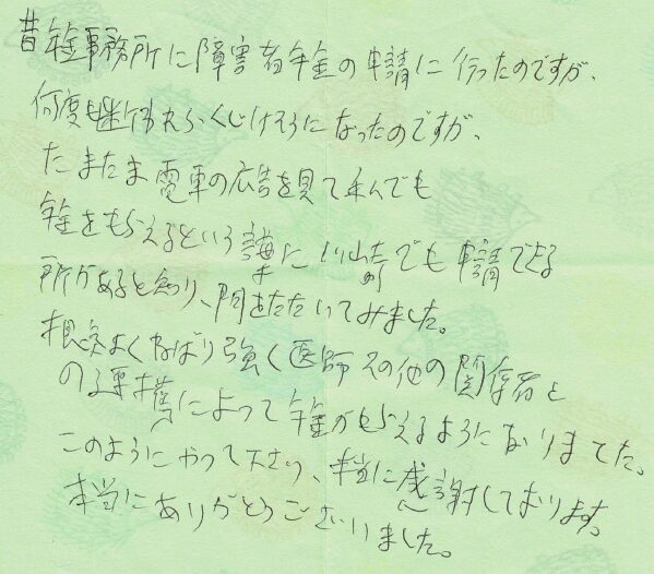 (スタッフより) この度はお手紙をいただきありがとうございました。受給が決まり私共も大変うれしく思っております。今後も迅速な対応を心掛け、安心してご依頼していただけるよう努力してまいります。