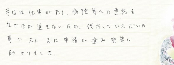 平日は仕事があり、病院等への連絡もなかなか進まないため、代行していただいた事でスムーズに申請が進み非常に助かりました。