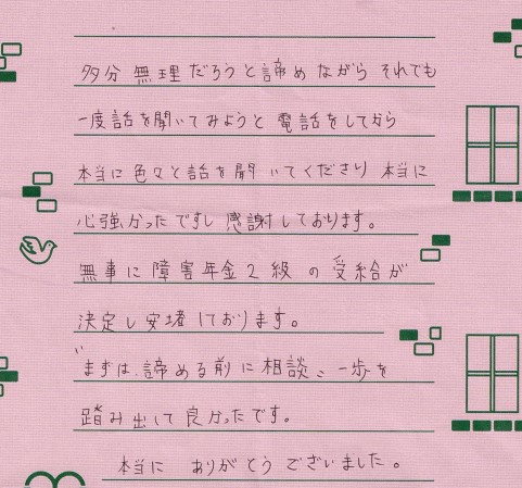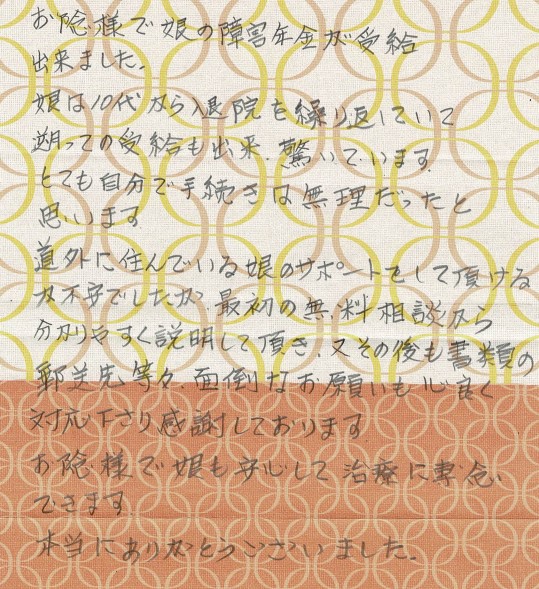 (スタッフより) この度はお手紙をいただきありがとうございました。受給が決まり私共も大変うれしく思っております。今後もご依頼者様が安心して相談できるよう、丁寧、親切な対応を心がけていきたいと思います。