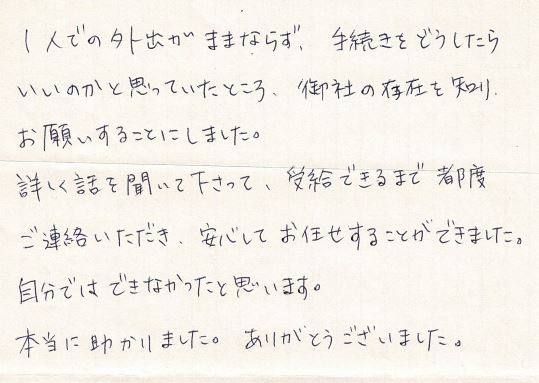 1人での外出がままならず、手続きをどうしたらいいのかと思っていたところ、御社の存在を知り、お願いすることにしました。