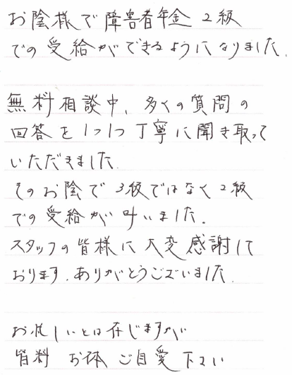 お陰様で障害者年金2級での受給ができるようになりました。無料相談中、多くの質問の回答を1つ1つ丁寧に聞き取っていただきました。そのお陰で3級ではなく2級での受給が叶いました。スタッフの皆様に大変感謝しております。ありがとうございました。お忙しいとは存じますが、皆様お体ご自愛下さい。