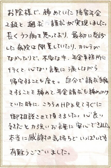 お陰様で、締めていた障害年金2級と遡及請求が実現しました。長くうつ病を患っており、最初に受診した病院は閉業していたり、カルテがなかったりで、不安な中、年金事務所に行くと、心ない言葉に涙しながら帰宅することも度々。自分で請求手続きすることを締めて年金請求も締めかけていた時に、こちらのHPを見てすぐに御相談させて頂きました。心良い対応と力強いお言葉に安心できました。本当に感謝の気持ちでいっぱいです。有難うございました。