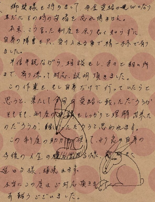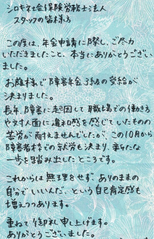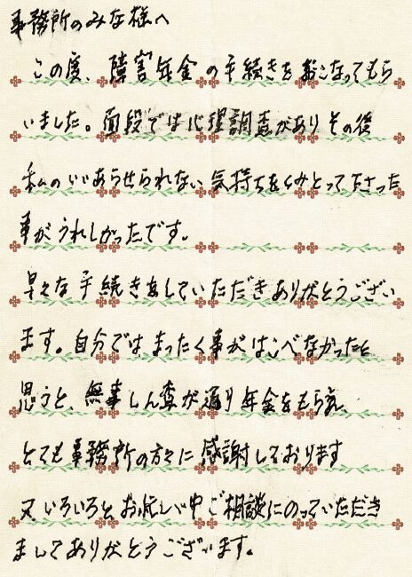 (スタッフより) この度はお手紙をいただきありがとうございました。受給が決まり私共も大変うれしく思っております。今後も安心してご依頼していただけるよう、精一杯サポートさせていただきたいと思います。