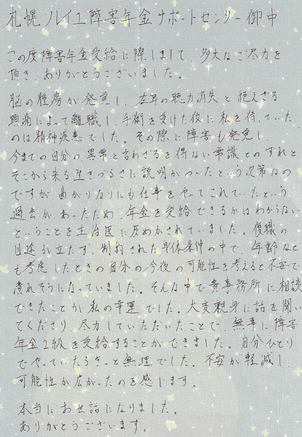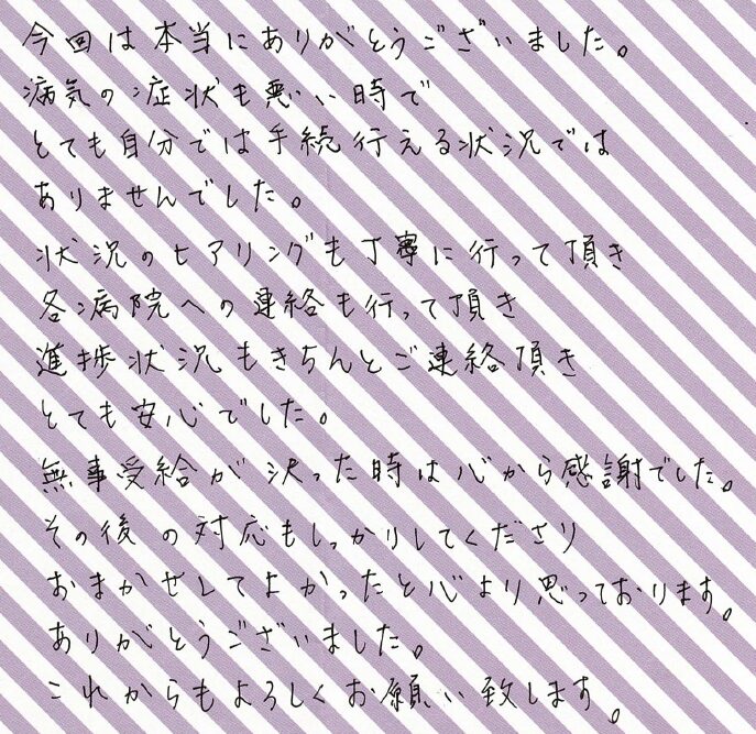 (スタッフより) この度はお手紙をいただきありがとうございました。受給が決まり私共も大変うれしく思っております。今後も適切な連絡を欠かさず、安心してご依頼していただけるようサポートをしてまいります。