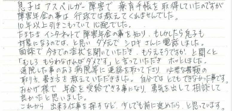 たまたまインターネットで障害年金の事を知り、もしかしたら息子も対象になるのでは、と思いダメ元でシロキさんに電話しました。