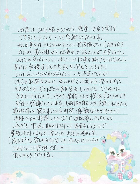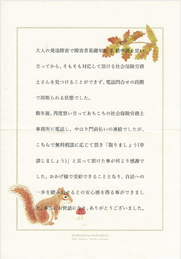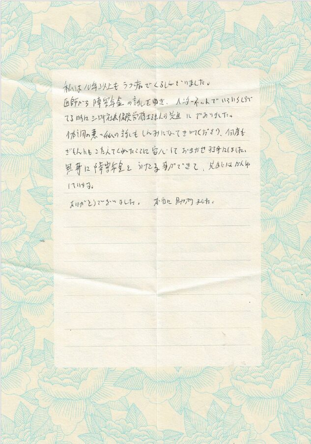 (スタッフより)                                                                             この度はお手紙をいただきありがとうございました。受給が決まり私共も大変うれしく思っております。今後も依頼者様に親身で寄り添ったサポートを心掛けてまいります。