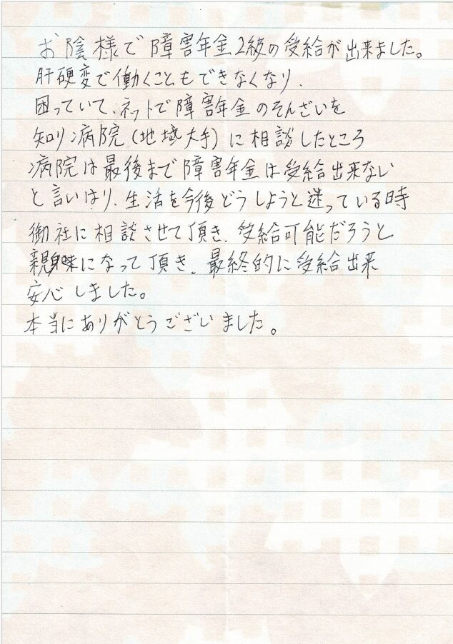 肝硬変で働くこともできなくなり、困っていて、ネットで障害年金のそんざいを知り病院(地域大手)に相談したところ病院は最後まで障害年金は受給出来ないと言いはり生活を今後どうしようと迷っている時御社に相談させて頂き、受給可能だろうと親身になって頂き、最終的に受給出来安心しました。