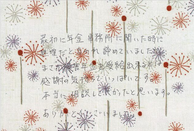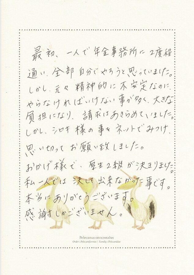 この度はシロキ様のおかげで無事、年金を受給できることになりとても感謝しております。