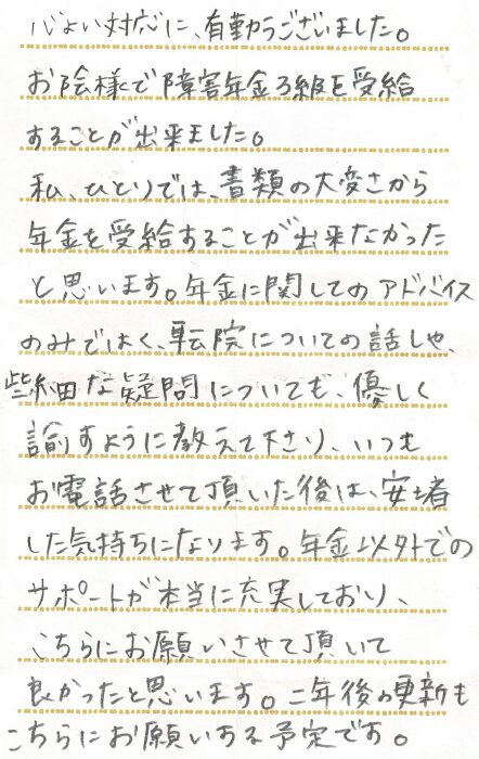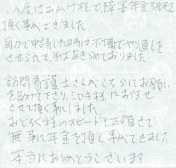 (スタッフより) この度はお手紙をいただきありがとうございました。受給が決まり私共も大変うれしく思っております。今後もご依頼者様に寄り添い、丁寧なサポートを心掛けてまいります。
