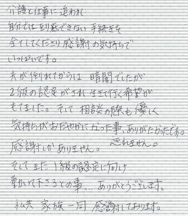 夫が倒れてからは暗闇でしたが2級の認定がされ生きて行く希望がもてました。そして相談の際も優しく気持ちがおだやかになった事、ありがたかったです。忘れません。感謝しかありません。