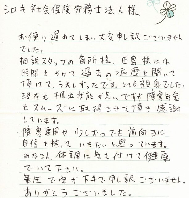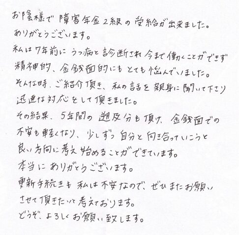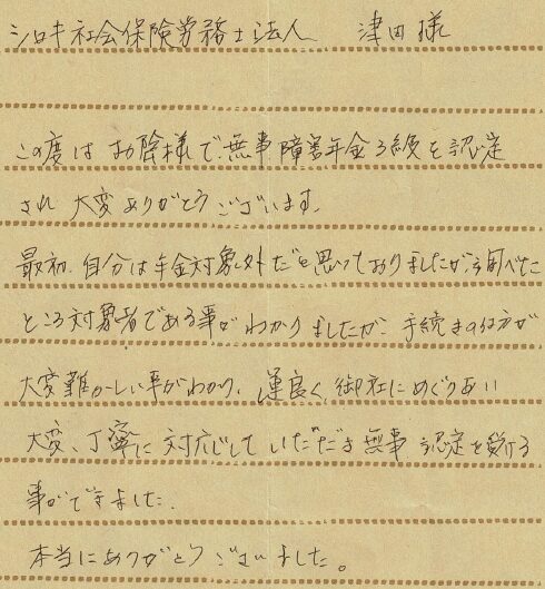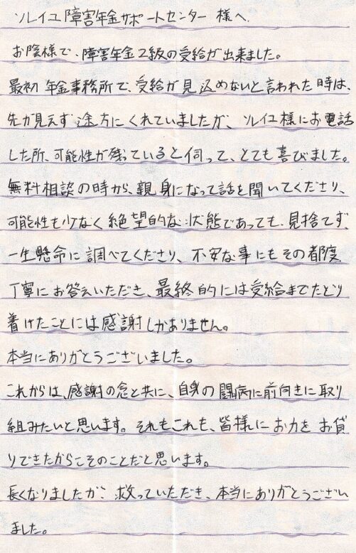 (スタッフより) この度はお手紙をいただきありがとうございました。受給が決まり私共も大変うれしく思っております。今後も安心してご依頼していただけるよう精一杯サポートさせていただきたいと思います。