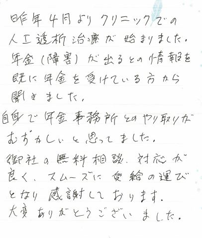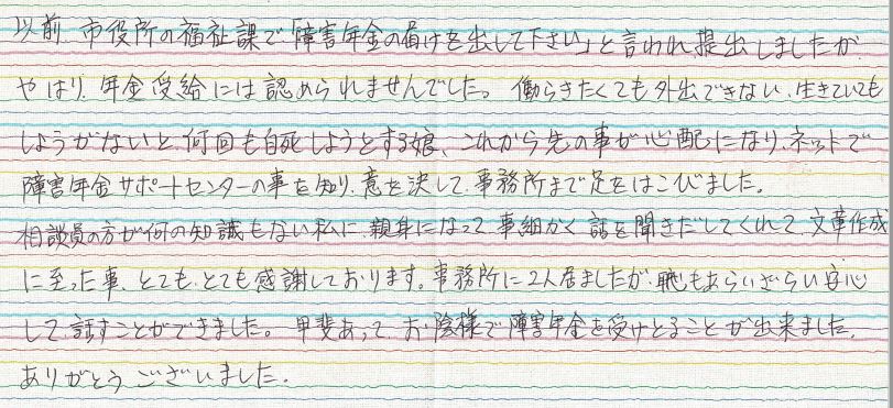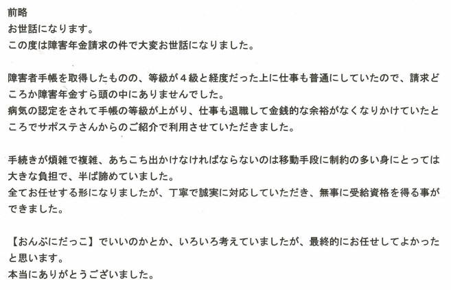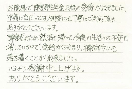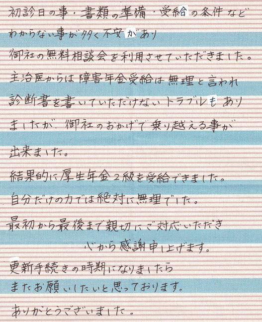 (スタッフより)                                                                             この度はお手紙をいただきありがとうございました。受給が決まり私共も大変うれしく思っております。今後もご依頼者様が受給できる様精一杯対応させていただきたいと思います。またいつでもご相談下さい。
