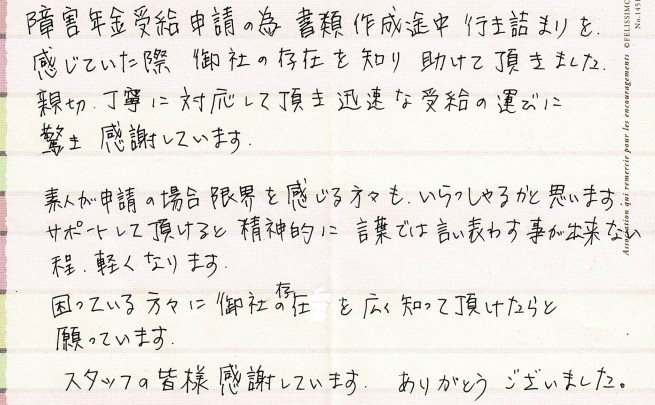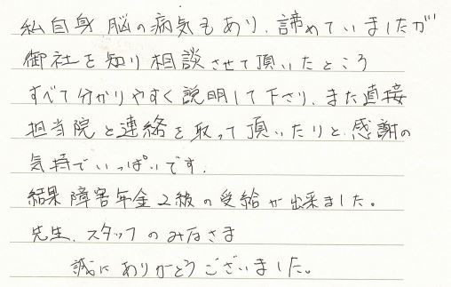 障害年金受給申請の為、書類作成途中行き詰まりを感じていた際、御社の存在を知り助けていただきました。親切丁寧に対応して頂き、迅速な受給の運びに驚き、感謝しています。素人が申請の場合、限界を感じる方々もいらっしゃるかと思います。サポートして頂けると精神的に言葉では言い表す事が出来ない程、軽くなります。困っている方々に御社の存在を広く知って頂けたらと願っています。スタッフの皆様に感謝しています。ありがとうございました。
