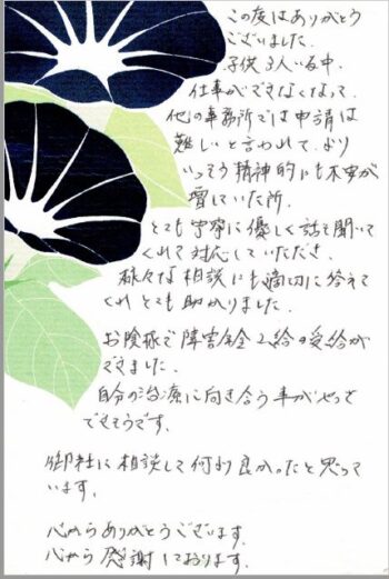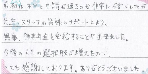 最初は本当に申請が通るのか非常に不安でしたが、先生、スタッフの皆様のサポートにより、無事、障害年金の受給をすることが出来ました。