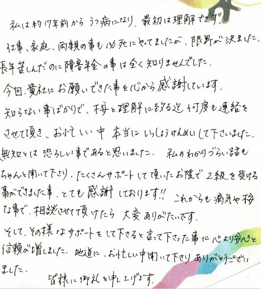 お蔭様で障害年金2級の受給ができました。自分の治療に向き合う事がやっとできそうです。