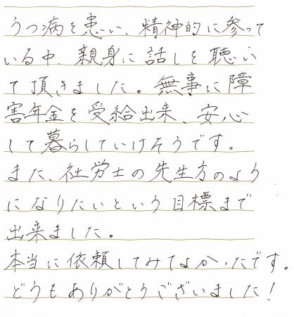 うつ病を患い、精神的に参っている中、親身に話を聞いて頂きました。無事に障害年金を受給でき、安心して暮らしていけそうです。