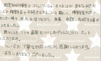 軽度知的障害でコミュニケーションをとることが、苦手な子供が1人で障害年金の手続きをすることは難しく、障害年金サポートセンター様のお力を借りながら、無事、申請、受給する事ができました。