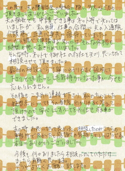 (スタッフより) この度はお手紙をいただきありがとうございました。受給が決まり私共も大変うれしく思っております。今後もご依頼者様に対して、丁寧な説明と対応を心がけてまいりたいと思います。