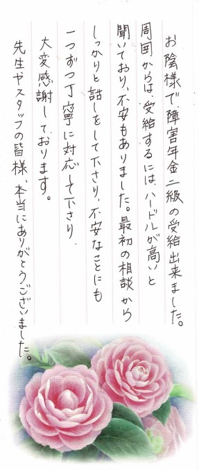 (スタッフより) この度はお手紙をいただきありがとうございました。受給が決まり私共も大変うれしく思っております。今後もご依頼者様が安心して頂けるよう、精一杯サポートさせて頂きたいと思います。
