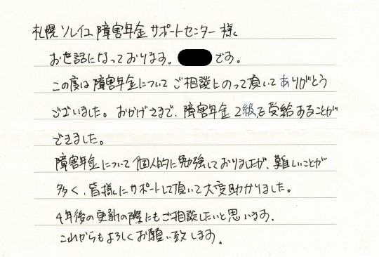 (スタッフより) この度はお手紙をいただきありがとうございました。受給が決まり私共も大変うれしく思っております。今後もご依頼者様に寄り添ったサポートを心がけてまいりたいと思います。