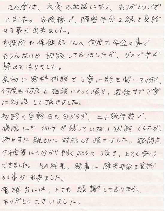この度は、大変お世話になり、ありがとうございました。お陰様で、障害年金2級を受給する事が出来ました。市役所や保健師さんへ何度も年金のことでもらえないか相談しておりましたが、ダメで半ば諦めておりました。最初に無料相談で丁寧に話を聞いて頂き、何度も何度も相談にのって頂き、最後まで丁寧に対応して頂きました。初診の受診日も分からず、二十数年前で病院にもカルテが残っていない状態でしたが、諦めずに親切に対応して頂きました。疑問点や不安等にもわかりやすく応えて頂き、とても安心できました。その結果、無事に障害年金を受給する事が出来ました。皆様方には、とても感謝しております。ありがとうございました。