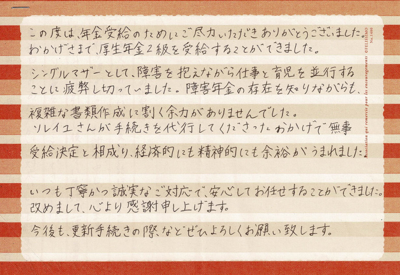 (スタッフより) この度はお手紙をいただきありがとうございました。受給が決まり私共も大変うれしく思っております。今後もご依頼者様に対して丁寧な対応を心がけ、安心してご依頼していただけるよう努力してまいりたいと思います。