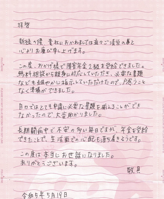 (スタッフより) この度はお手紙をいただきありがとうございました。受給が決まり私共も大変うれしく思っております。少しでもお役に立てたこと嬉しく思います。今後は安心して療養していただきたいと思います。