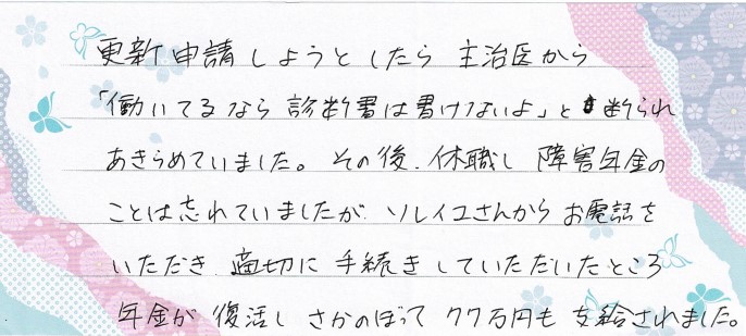 更新申請しようとしたら主治医から「働いてるなら診断書は書けないよ」と断られあきらめていました。その後、休職し、障害年金のことは忘れていましたが、ソレイユさんからお電話をいただき適切に手続きしていただいたところ、年金が復活しさかのぼって77万円も支給されました。