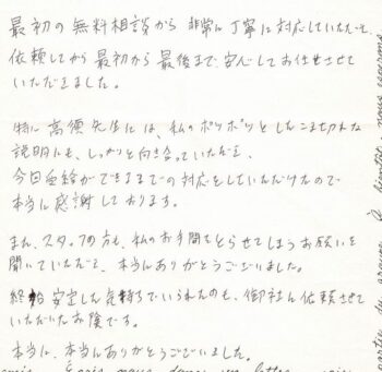 最初の無料相談から非常に丁寧に対応していただき、依頼してから最初から最後まで安心してお任せさせていただきました。